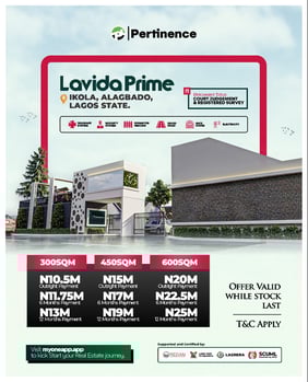 Lavida Prime, a premium residential estate by Pertinence, strategically located in Ikola, Alagbado, Lagos. This development is designed for families and investors who desire security, comfort, and a strong return on investment. Estate Features: Modern drainage system 24/7 security surveillance Perimeter fencing Well-paved road network Elegant gatehouse Electricity supply Available Plot Sizes & Pricing: 🔹 300 SQM ₦10.5M (3 Months) ₦11.75M (6 Months) ₦13M (12 Months) 🔹 450 SQM ₦15M (3 Months) ₦17M (6 Months) ₦19M (12 Months) 🔹 600 SQM ₦20M (3 Months) ₦22.5M (6 Months) ₦25M (12 Months) With its strategic location, flexible payment options, and top-notch infrastructure, Lavida Prime is more than land—it’s an investment in a thriving future. 📍 Own your piece of Lagos today at Lavida Prime, Ikola – Alagbado.