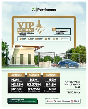 Introducing VIP Gardens, a premium residential estate by Pertinence, strategically located along Aba Road, Agbala, Owerri, Imo State. Designed with comfort, security, and long-term value in mind, this estate offers you an excellent opportunity to own land in one of Owerri’s fastest-developing locations. Property Title: Registered Survey Estate Features: Standard drainage system 24/7 security surveillance Perimeter fencing Paved road network Modern gatehouse Electricity supply Available Plot Sizes & Pricing: 300 SQM 🔹 ₦2M (Outright) 🔹 ₦2.25M (6 Months) 🔹 ₦2.5M (12 Months) 450 SQM 🔹 ₦3M (Outright) 🔹 ₦3.375M (6 Months) 🔹 ₦3.75M (12 Months) 600 SQM 🔹 ₦4M (Outright) 🔹 ₦4.5M (6 Months) 🔹 ₦5M (12 Months) Why Invest in VIP Gardens? With its prime location, modern infrastructure, and a Global C of O, VIP Gardens guarantees you peace of mind and excellent returns on investment. Whether you’re building your dream home or securing land for the future, VIP Gardens is the right choice. 📍 Invest smart. Live comfortably. Own land today at VIP Gardens, Owerri.